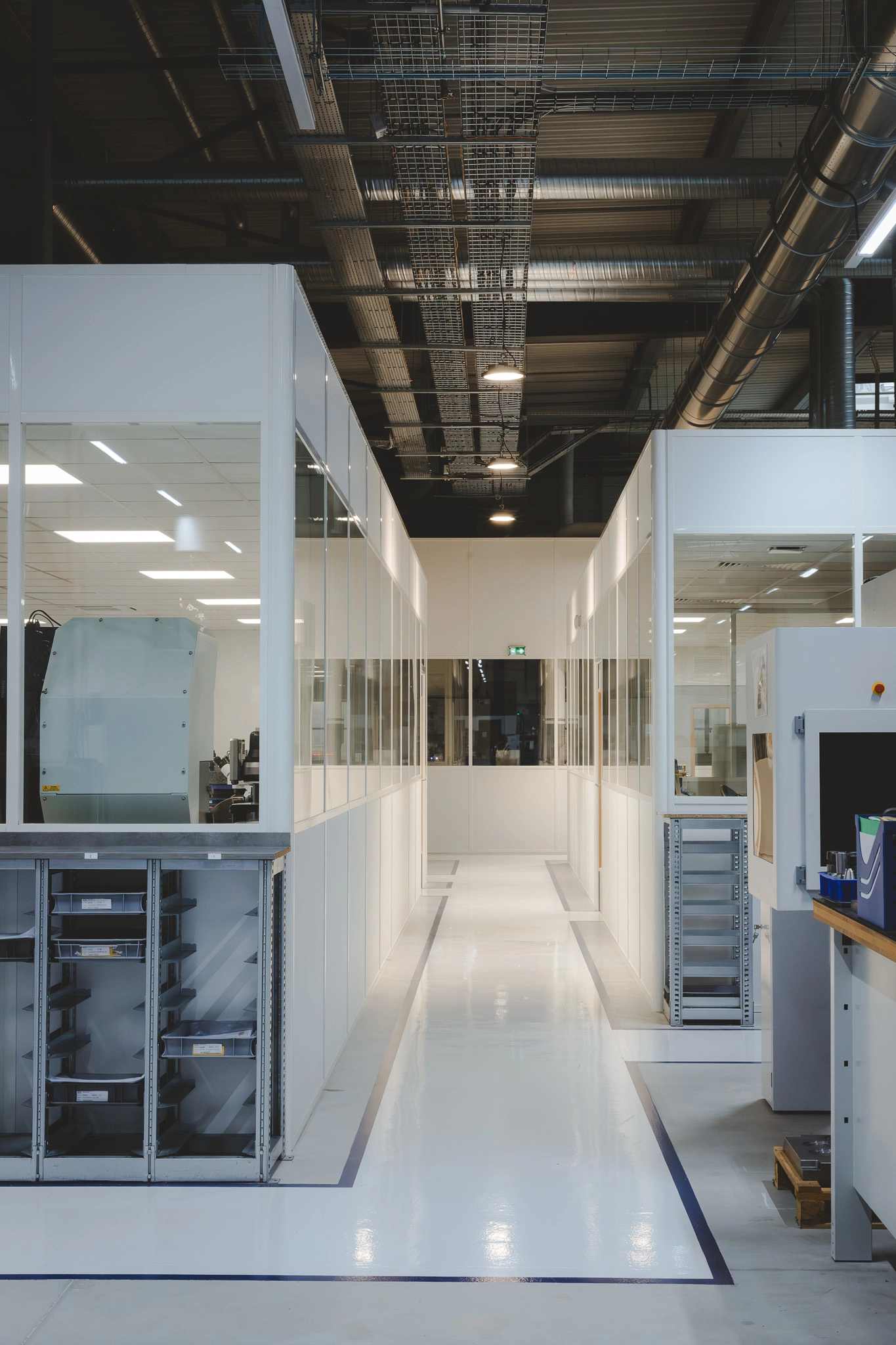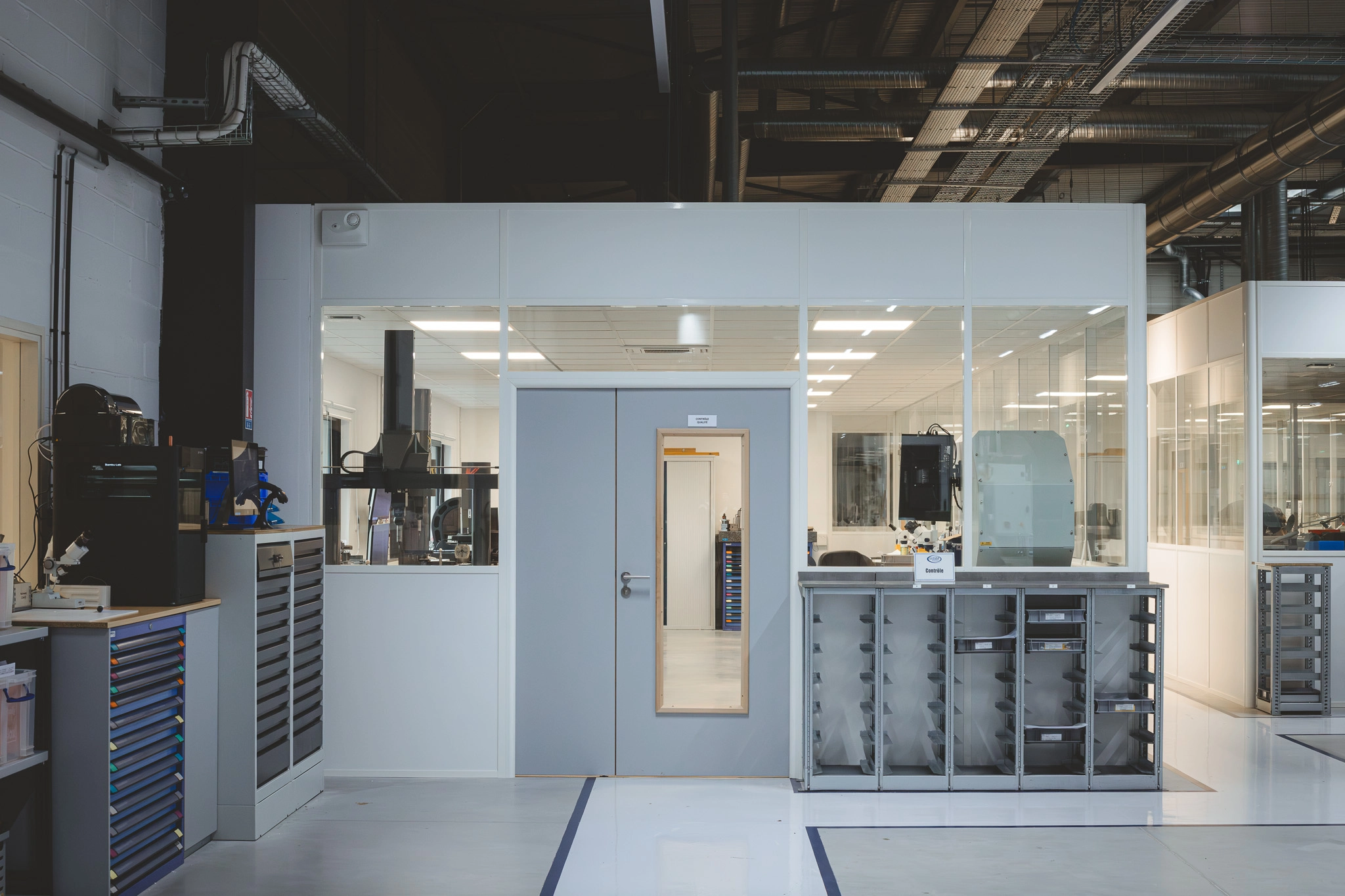 Les bureaux sont séparés de l’atelier par des cloisons vitrées en panneaux isothermes. Cette solution offre une vue directe sur les espaces de production, tout en préservant le confort acoustique et thermique.